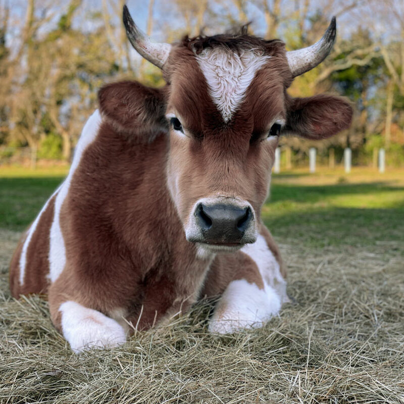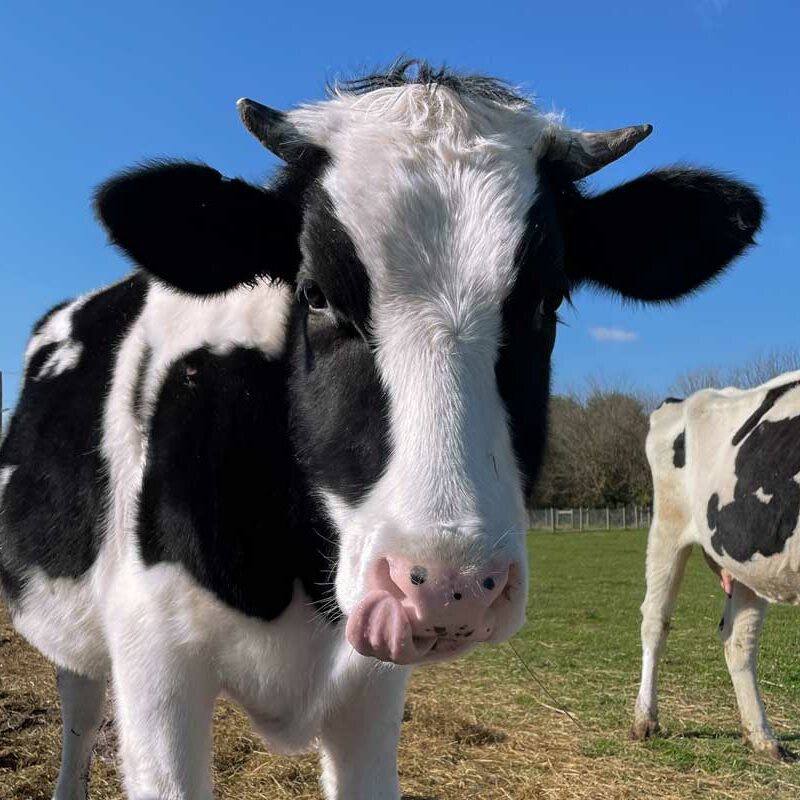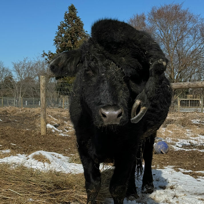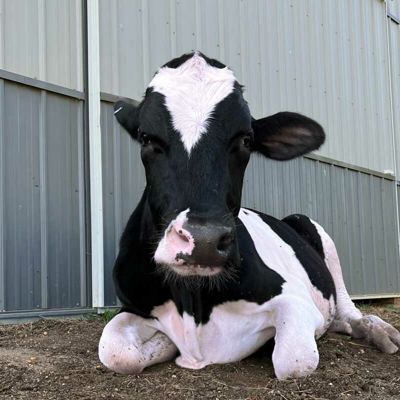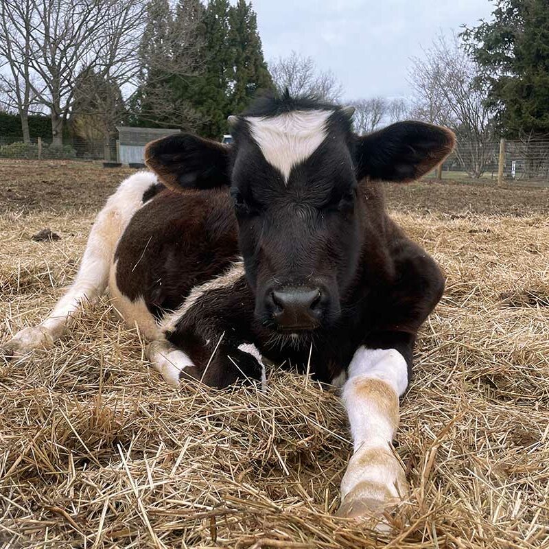 Evie was liberated from a dairy farm on December 23, 2021 at the age of four. On September 26th, 2021, we took a trip to a dairy farm to liberate three cows, and as we were walking through the dairy barn, we locked eyes with Evie who was laying on the ground alone, withdrawn from the rest of herd. We knew in that moment that we had to help her, so we asked the farmer if he would be willing to surrender Evie to us instead of sending her to slaughter when her time came. A few months later in December, we received an unexpected call. The farmer remembered that we connected with Evie and let us know that she would be sent to slaughter if we didn’t take her. She had become more and more withdrawn as the days went by, and her milk production had slowed so much that the farm no longer considered her profitable. For this reason, she was of no use to them and they were going to send her to the slaughterhouse. We offered Evie a home on the spot and picked her up the following week. Evie is living now free and living a happy, safe, fulfilled life at UNH where the love and bananas are ever flowing.