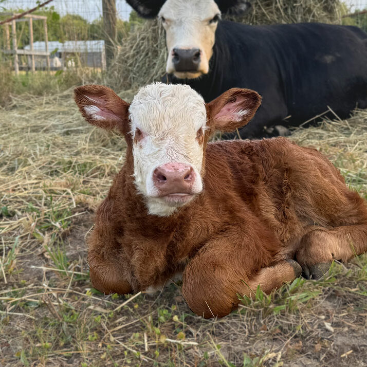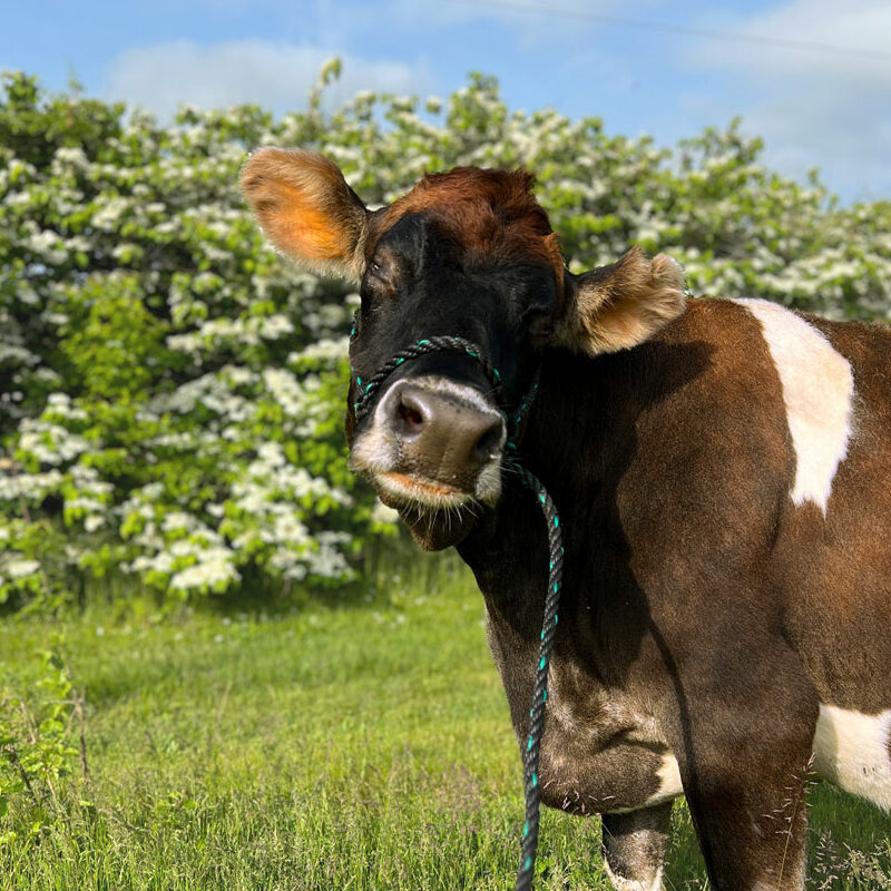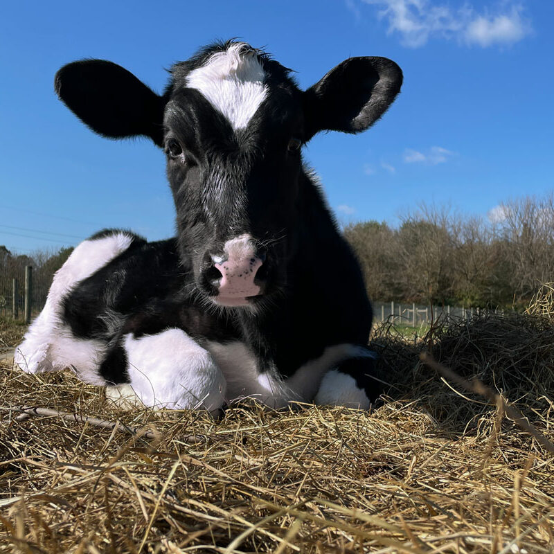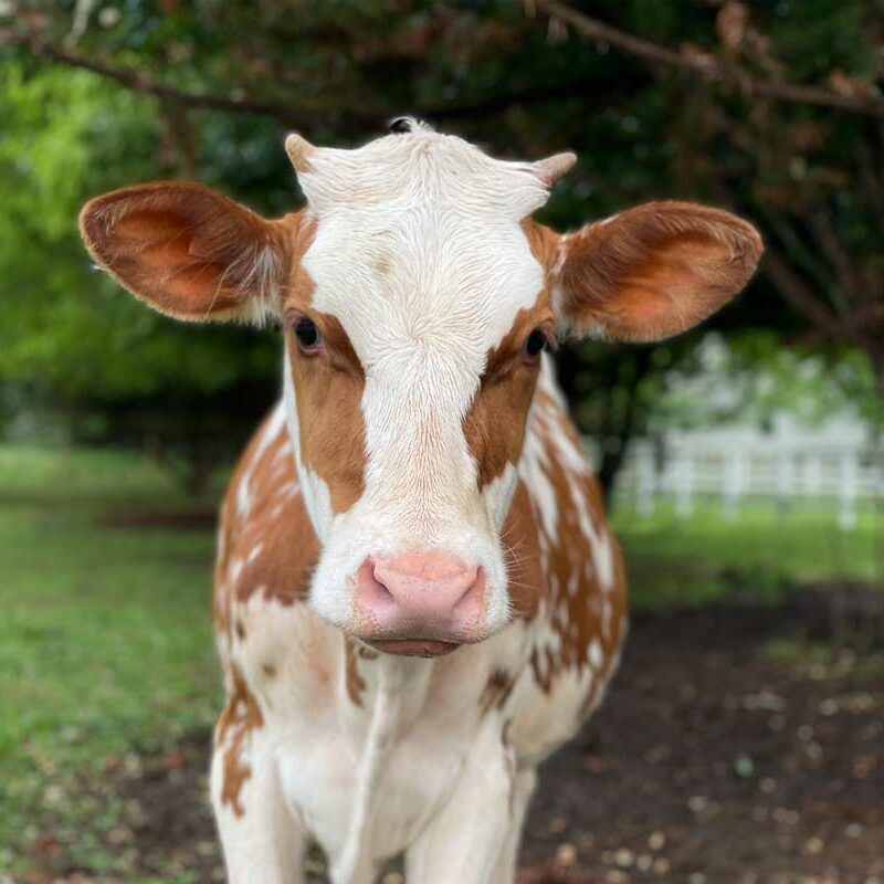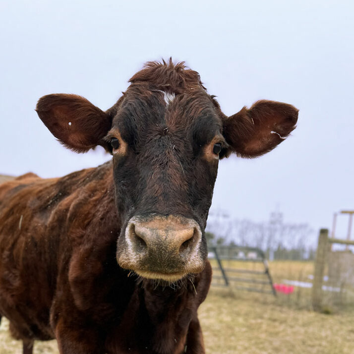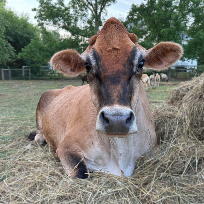 Evie was liberated from a dairy farm on December 23, 2021 at the age of four. On September 26th, 2021, we took a trip to a dairy farm to liberate three cows, and as we were walking through the dairy barn, we locked eyes with Evie who was laying on the ground alone, withdrawn from the rest of herd. We knew in that moment that we had to help her, so we asked the farmer if he would be willing to surrender Evie to us instead of sending her to slaughter when her time came. A few months later in December, we received an unexpected call. The farmer remembered that we connected with Evie and let us know that she would be sent to slaughter if we didn’t take her. She had become more and more withdrawn as the days went by, and her milk production had slowed so much that the farm no longer considered her profitable. For this reason, she was of no use to them and they were going to send her to the slaughterhouse. We offered Evie a home on the spot and picked her up the following week. Evie is living now free and living a happy, safe, fulfilled life at UNH where the love and bananas are ever flowing.
