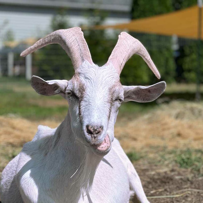 Gerald, along with his brother Gus, arrived at UNH on May 15, 2021 after concerned citizens saw that they were being given away for free on Craigslist. We knew that there was a major risk that Gus and Gerald could end up in the wrong hands, so we coordinated their release and transport, and brought them home to UNH. They joined Moe, Pip and Boris, and the five of them make up UNH’s goat gang!