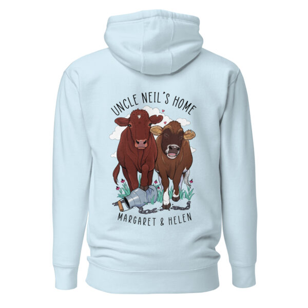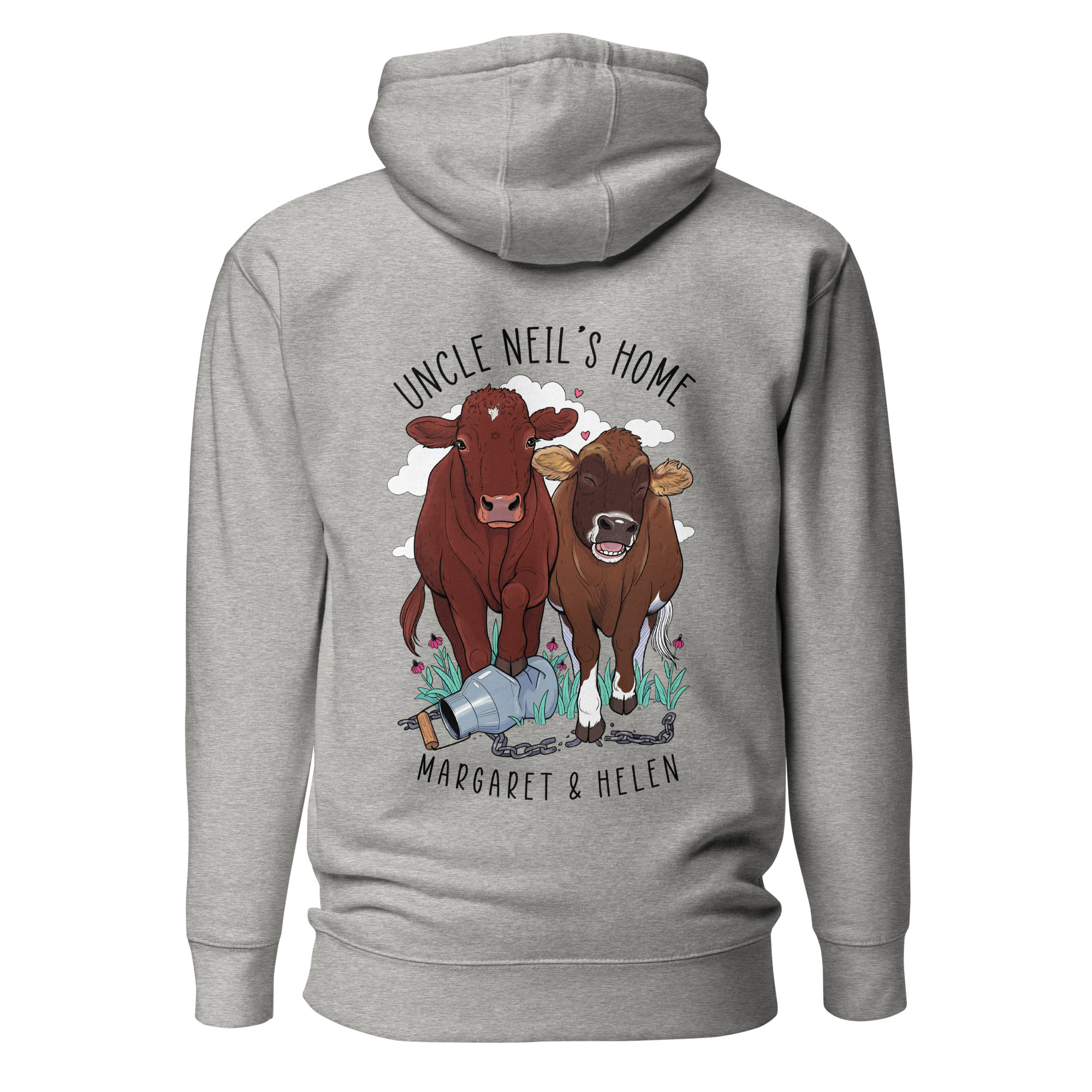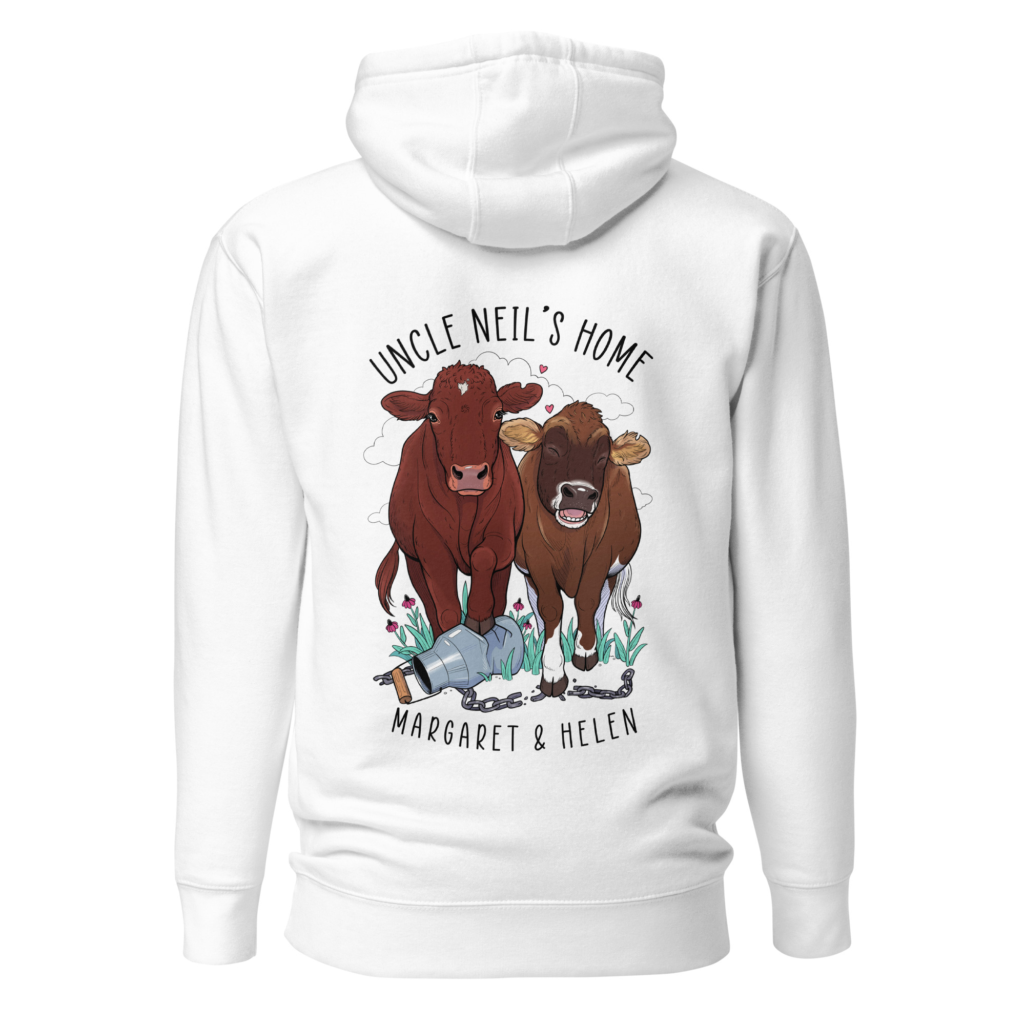 This hoodie features Helen and Margaret who were both liberated from dairy farms and now live happily in sanctuary at Uncle Neil’s Home. They are best friends and true survivors. 100% of the proceeds from sales of this design go towards their ongoing care. Thank you for your support!